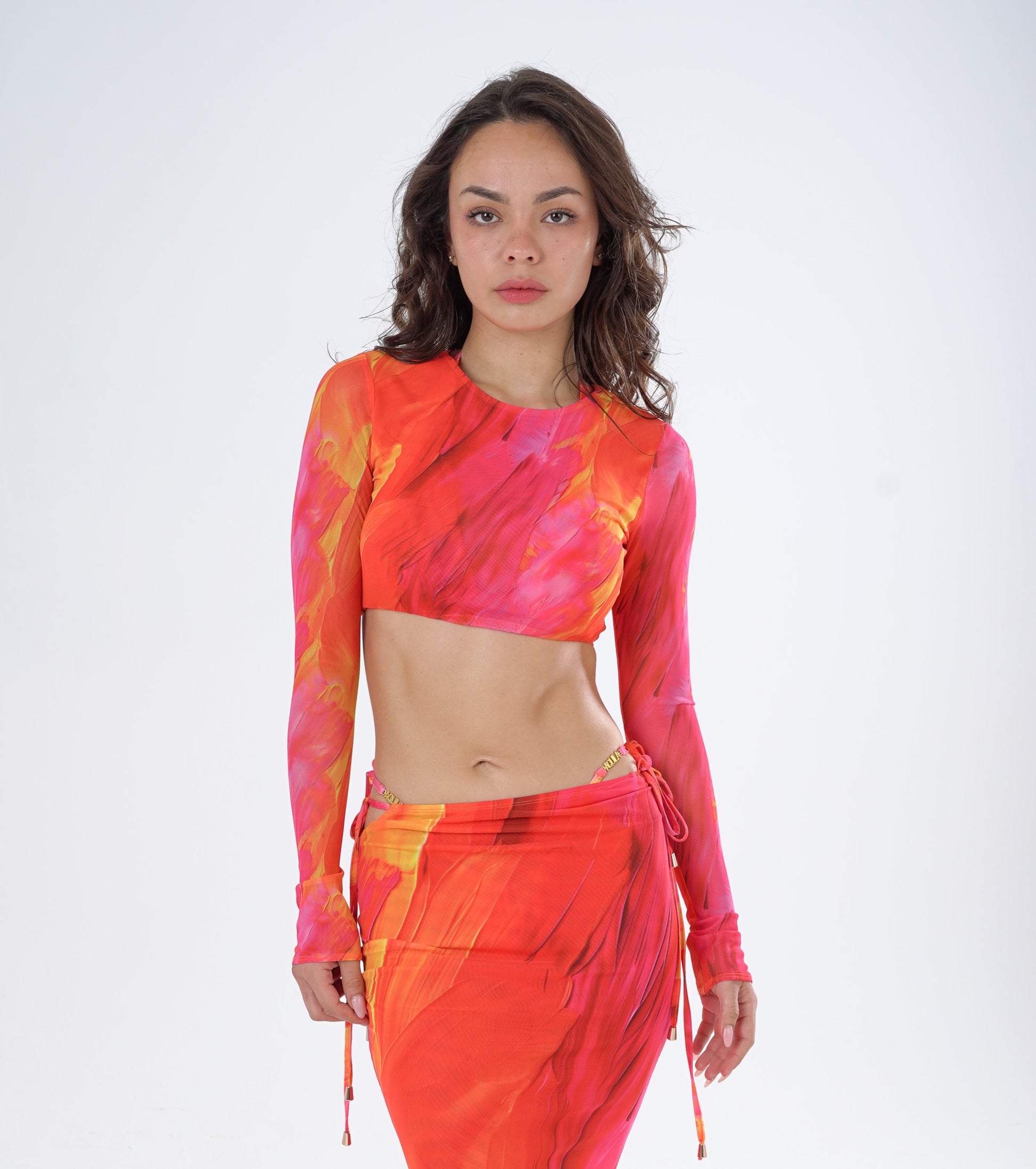Model is 5'7ft, wears UK 4-6 and 32C Bra Cup wearing an XS crop top.
